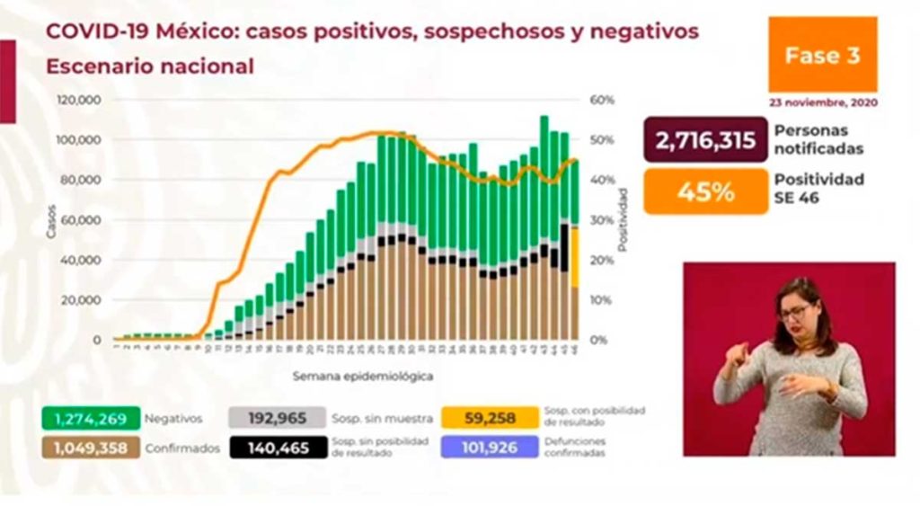 La pandemia de Covid-19 registró 7 mil 483 nuevas confirmaciones de la enfermedad para un acumulado de un millón 49 mil 358. También, en las pasadas 24 horas se sumaron 250 defunciones, con lo que 101 mil 926 personas han perdido la vida a causa de complicaciones graves de la infección por el coronavirus.