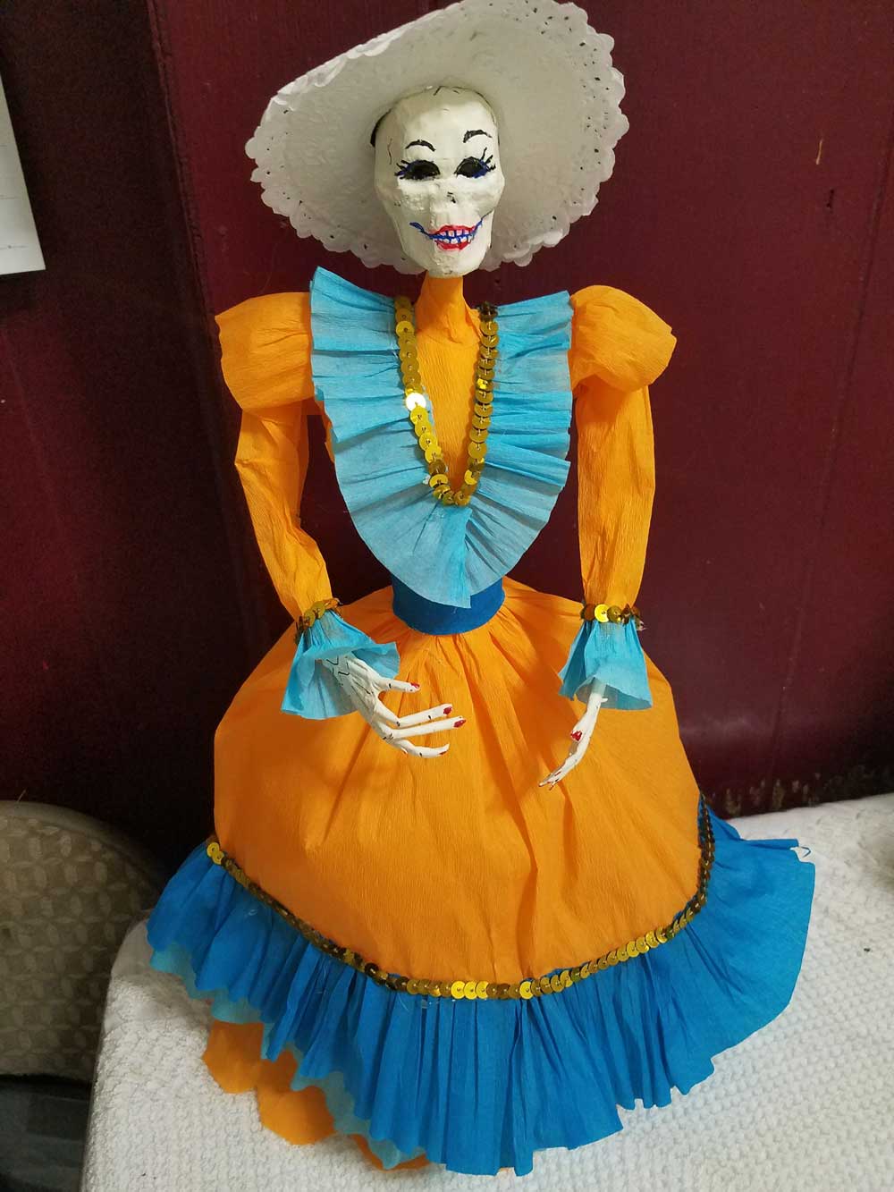“Voy a presentar dos figuras que son un homenaje al Día de los Muertos, con el personaje llamada Katrina, creada en México para refutar a las hijas de nativos mexicanos y españolas a quienes no les gustaba sus raíces. Ellas se trataban de vestir como españolas pero quedaban en ridículo. y por eso el personaje fue creado para hacer sátira de estas jóvenes”, dijo Aurelia Fernández. Este personaje fue creado por el caricaturista y periodista José Guadalupe Posada, cuya obra fue posteriormente pintada por Diego Rivera, usando una pintura exagerada de cuerpo entero, como una crítica a la falta de identidad cultural.