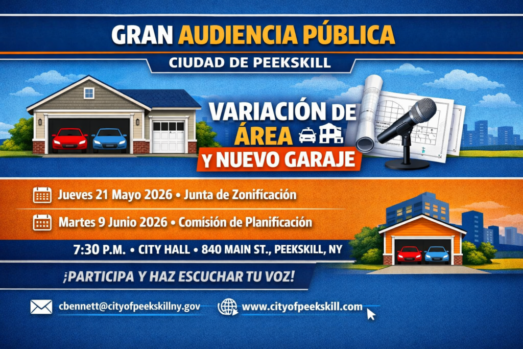 POR LA PRESENTE SE NOTIFICA que, de conformidad con las Secciones 575-55 de la Ordenanza de Zonificación de la Ciudad de Peekskill, la Junta de Apelaciones de Zonificación de la Ciudad de Peekskill celebrará una Audiencia Pública en la Sala del Concejo del Ayuntamiento (City Hall), ubicada en 840 Main Street, Peekskill, Nueva York, el jueves 21 de mayo de 2026 a las 7:30 p. m., o tan pronto como sea posible después de dicha hora, con respecto a la siguiente solicitud: