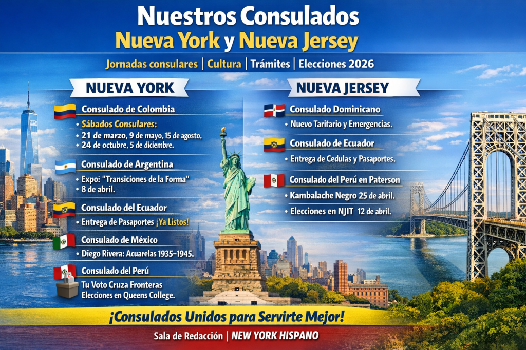 Consulta esta edición con fechas clave, servicios consulares y actividades culturales organizadas por consulados latinoamericanos en Nueva York y Nueva Jersey.