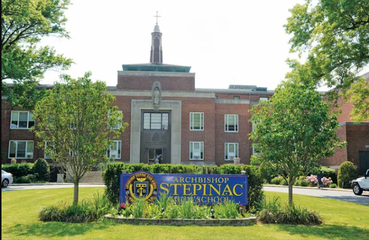 Vista exterior del edificio escolar de Stepinac en White Plains.