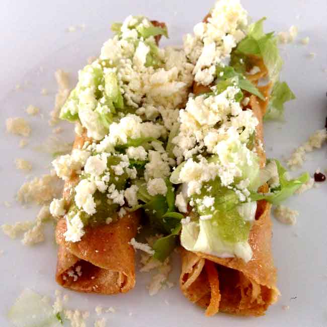 Ahora vamos a calentar en el microondas, por unos 20 segundos, las tortillas de maíz para que se hagan un poco más flojas. Colocamos una porción de pollo en el borde de la tortilla y la enrollamos. Calentamos el aceite en un sartén y ponemos a freír las flautas previamente formadas colocando la parte que se abre hacia abajo. Esto hará que la tortilla endurezca y ya no se abra la flauta. Dejamos unos 3 minutos de ambos lados para que las flautas queden bien doraditas. Servimos caliente con salsa verde mexicana, crema y queso rallado.