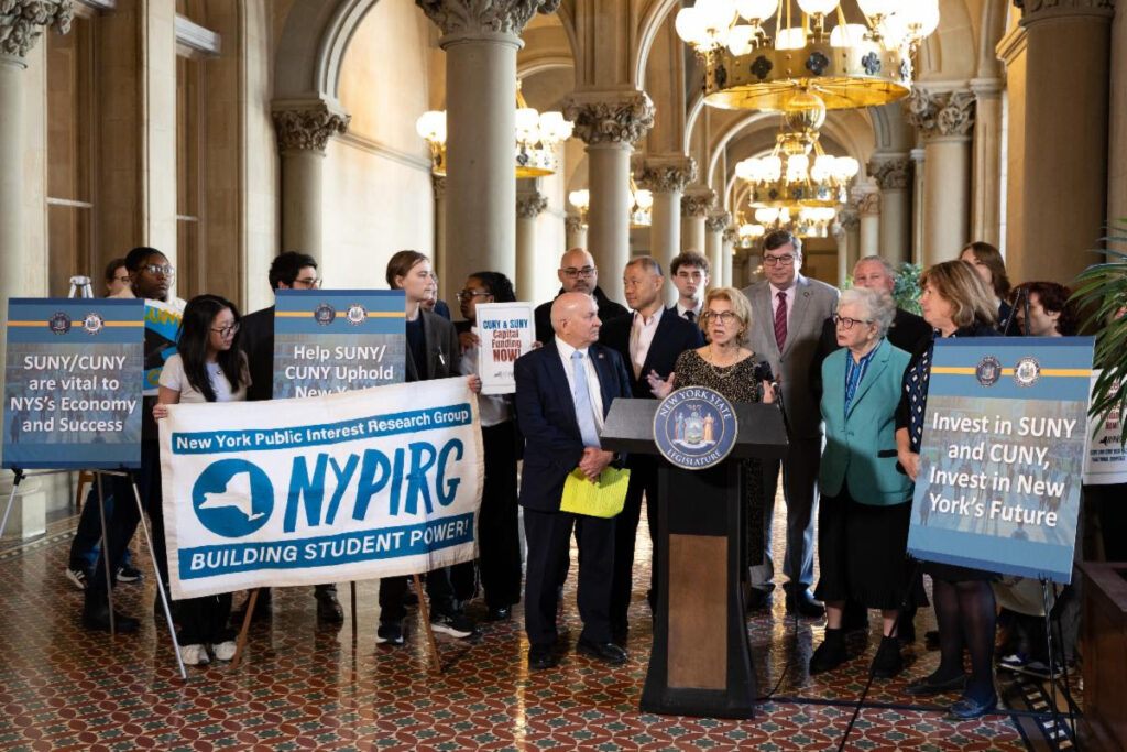 En Albany, la senadora Shelley Mayer y el asambleísta Chris Burdick, junto a otros legisladores, estudiantes y representantes laborales, instaron a incluir financiamiento crítico de infraestructura para SUNY y CUNY en el presupuesto estatal final.