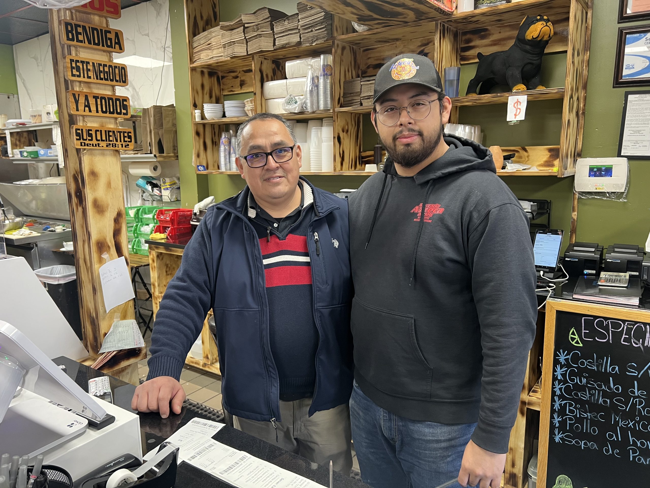Luis Galindo, propietario de Mercado Azteca Deli, junto a su hijo que le ayuda a administrar el negocio. Foto WH