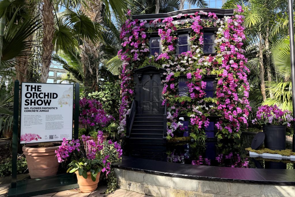 Un oasis de miles de orquídeas florece entre el asfalto, las alcantarillas, las escaleras de incendio, las vallas, las bocas de metro y hasta las lavadoras de una lavandería en la popular exposición anual de orquídeas del Jardín Botánico de Nueva York (NYBG), que este año fue diseñada por Mr. Flower Fantastic, un artista anónimo conocido por fusionar la floricultura con elementos de la cultura pop, el baloncesto y la moda callejera.