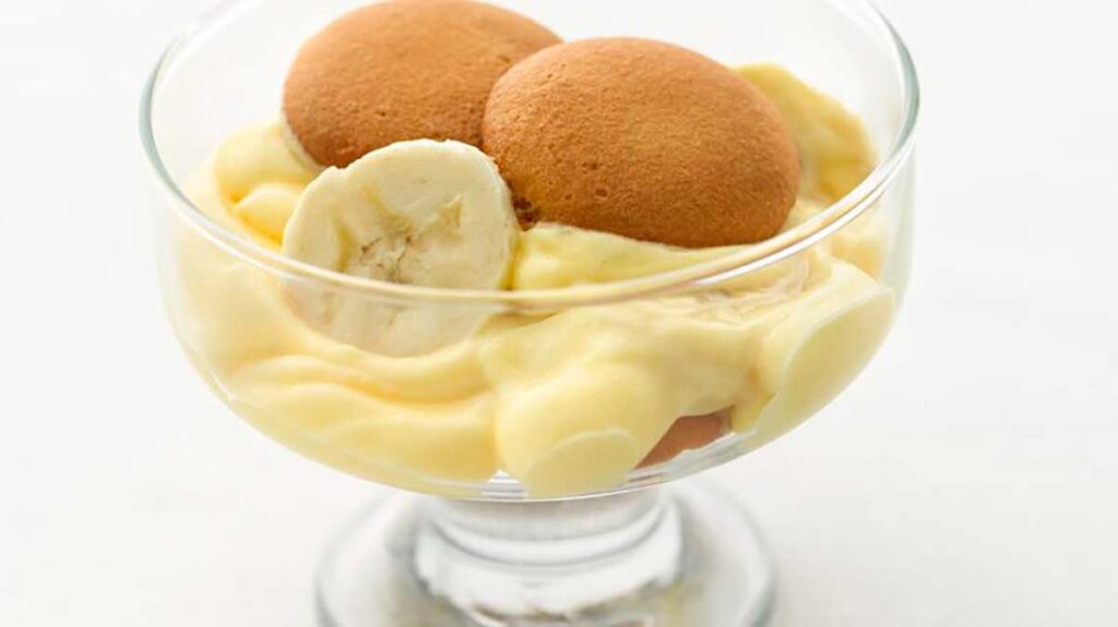 Justo antes de servir, coloque encima del pudín de plátano, luego espolvoree encime, galletas de barquillo desmenuzadas.