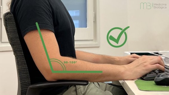 3. Mantén los brazos y muñecas alineados: Los codos deben estar cerca del cuerpo, formando también un ángulo de 90°, mientras que las muñecas deben permanecer rectas al usar el teclado o el ratón. Si es posible, utiliza un soporte ergonómico para teclado y mouse.