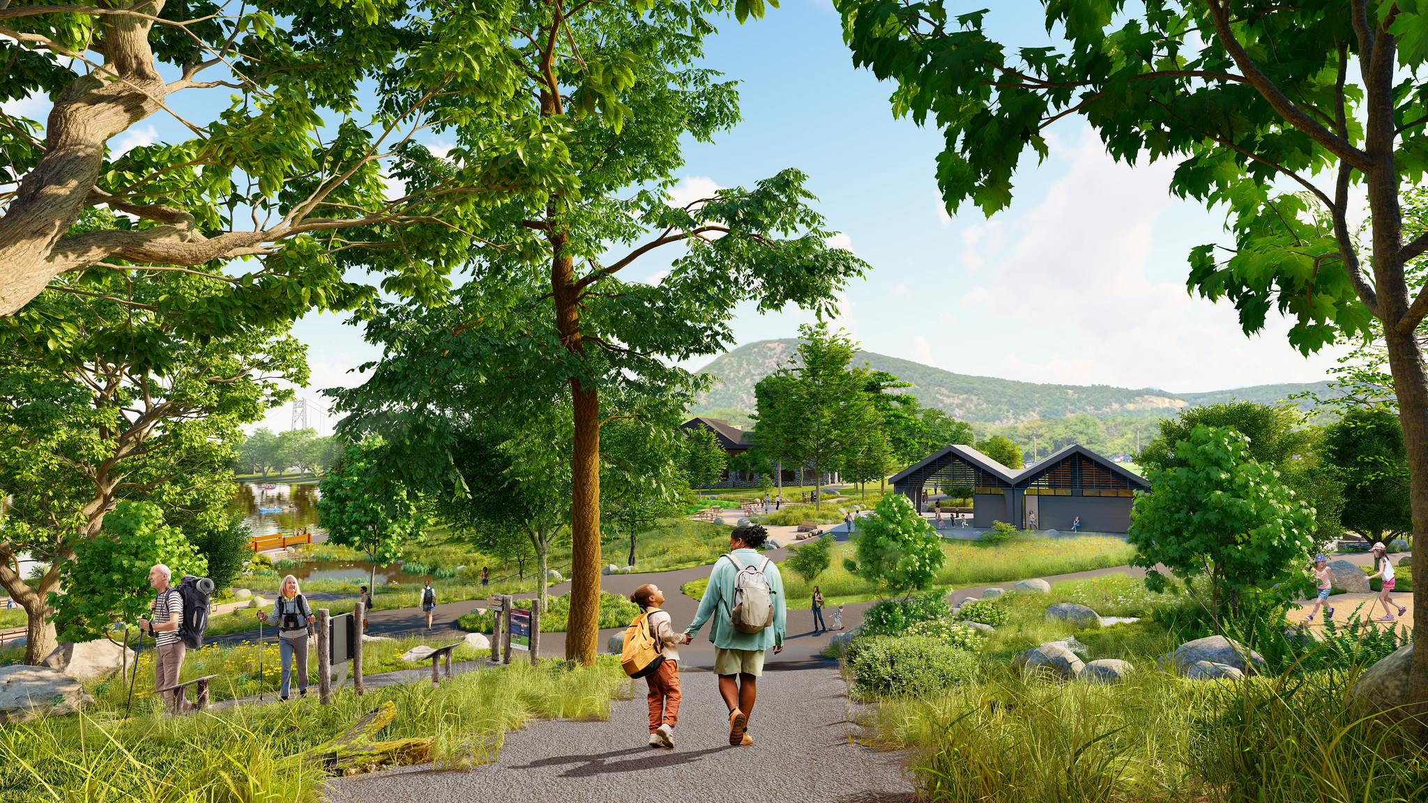 - Un nuevo parque infantil en la ladera de Bear Mountain, con áreas de juego de varios niveles conectadas por un sendero continuo adaptado para personas con discapacidad, trepadoras de rocas y toboganes de hasta 21 metros de largo. Una amplia variedad de elementos y estructuras de juego que representan la rica historia del parque, junto con plantas autóctonas, ofrecen un entorno de juego inmersivo para niños de todas las edades y capacidades.