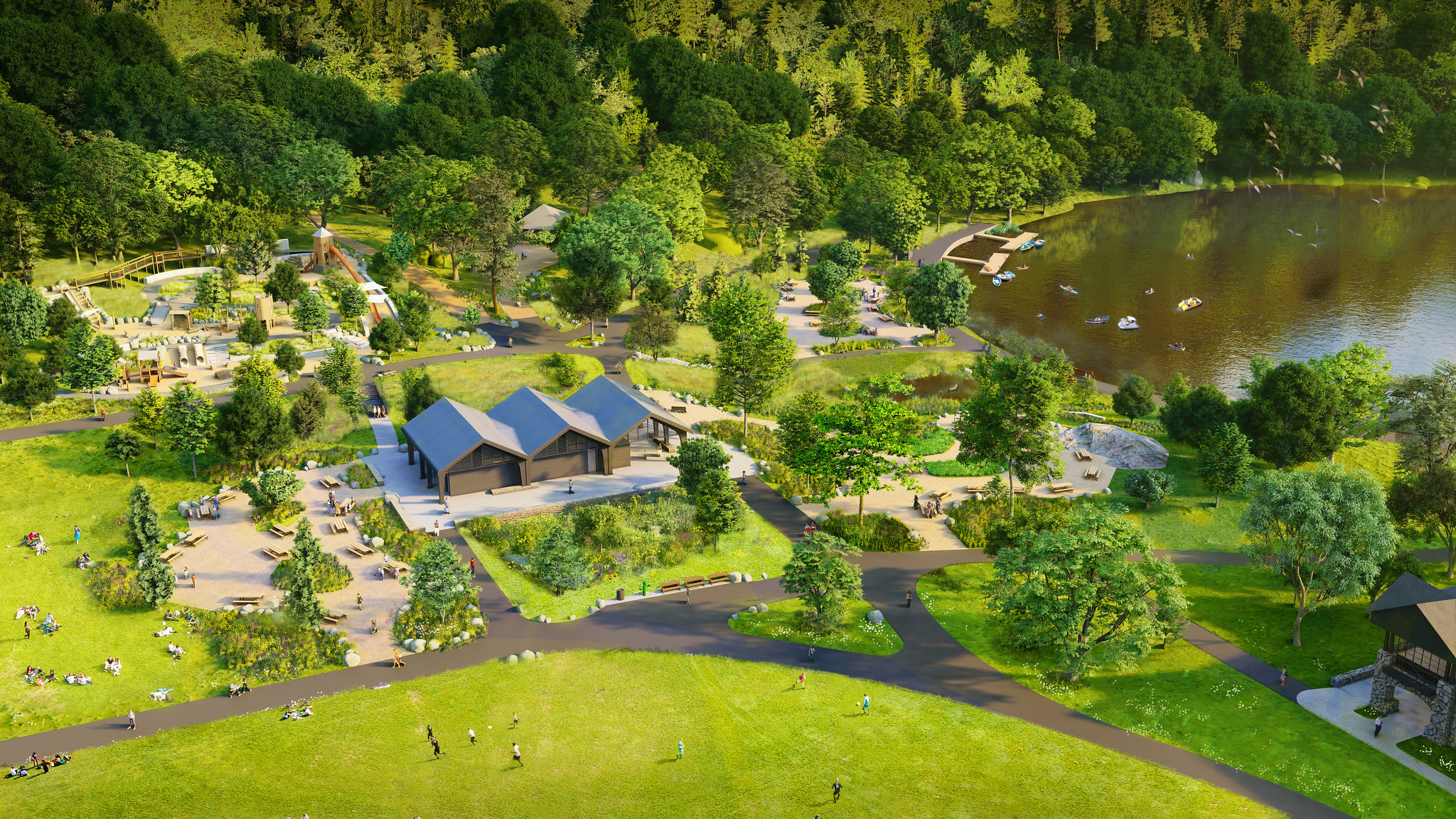 - Ampliación de las zonas de picnic pavimentadas a lo largo del lado oeste del césped principal y el extremo sur del lago Hessian para aumentar la capacidad y, al mismo tiempo, reducir la erosión del paisaje del parque y el impacto en los árboles existentes.