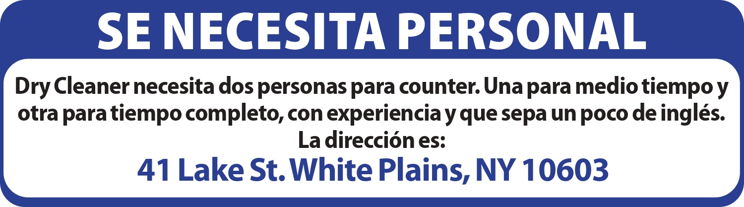 La tintorería necesita dos personas para el mostrador. Una para medio tiempo y otra para tiempo completo, con experiencia y que sepa un poco de inglés. La dirección es: 41 Lake St. White Plains, NY 10603